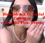 Sonntag Mittag eingeladen bei meinem Kumpel Björn zum Grillen... und siehe da die kleine geile Drecksau vom letzten Mal natürlich auch wieder dabei :-) Hatte dieses Mal wirklich nichts böses im Sinn... doch kaum war mein Kumpel kurz weg das Essen vorbereiten, sagt dieses geile Stück zu mir das Sie jetzt total geil auf nen Blowjob wäre... Da sag ich doch nicht nein *fg* ;-) Gesagt getan... Hose auf... Schwanz in ihr kleines Lutsch Maul... und los geht´s ! Hatte davor 3 Tage schon nicht mehr abgespritzt... also gab es eine richtig fette Belohnung. Einen XXL Facial Cumshot - Voll in die Fick Fresse !!! Ihr hättet das Gesicht von Björn sehen sollen als er wieder kam und ihre voll gekleisterte Fresse sah... :-)