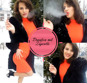Ich ziehe einen Pelz an und gehe draußen, um mir eine Zigarette zu rauchen. Bist du daran interessiert anzuschauen, wie ich Rauch aus meinem Mund blase?