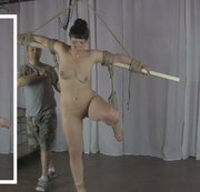 Wie bei einer Kreuzigung wird Yvette mit den Armen auf einen Balken gebunden und nach oben gezogen. Ein Bein von ihr wird ebenfalls nach oben fixiert. Sie hat nur schwer Ballance auf einem Bein und dann wird sie auch noch weiter hochgezogen. Sie steht nun nur noch auf den nackten Zehenspitzen eines Fusses..... Und dann beginnt erst die richtige Torture.....(Hook, Gewichte, Gerte, etc.)