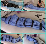 Amateur leather bondage video! I'm tied up with ropes in a leather blouse, opera gloves, leggings and a leather hood. But that is not all! My friend comes to me wrapped in a sl*eping bag. I'm tied up and in sle*ping bags. I feel more and more leather belts immobilize my already very tied body. Done, the mummy is complete. Futile effort to escape from the bag. I'm tired, sweating in sle*ping bag and my leather clothing. Again comes my friend. He lies beside me and rests. I suspect that my stay in the sl*eping bag will be long ...
