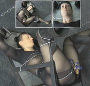 Yvette muss eine Ganzkörper-Strumpfhose tragen. An der Pussy und den Fusszehen wird diese aufgeschnitten. Dann wird sie mit Kabelbindern in einen Gynstuhl fixiert. Sogar der Hals wird nicht ausgelassen! Dann kommen noch enge Kabelbinder an die Fusszehen, die überstreckt werden. Schliesslich werden die Schamlippen mit Klammern versehen.... Jetzt kann das Spiel beginnen!