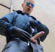 XL hung Officer is coming to an unobserved backyard and starts to show off. Soon he opens the zippers of his leather pants and plays with his huge german, uncut tool! The leather gloves makes him really hard. Suddenly this fully uniformed hunk shoots large fountains of hot piss through the camera angles. Enjoy this production of october 2014.