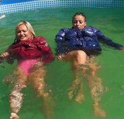 Mit Christina in Daunenjacken im Pool schwimmen