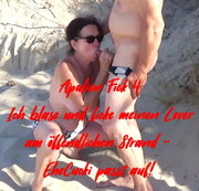 Am nächsten Tag bin ich mit meinen beiden Jungs an einem öffendlichen Strand und werde geil. Mein Ehemann-Cuckold peilt die Lage, meint es wäre niemand in der Nähe, ich blase meinen Lover und ficke dann mit ihm, habe einen schnellen Orgasmus. Der EheCucki passt auf und filmt alles schön, wir müssen dann aber abbrechen, denn es kommt jemand,schade es war zuuu kurz! Wir haben später am Tag nochmal gefickt, dazu folgt ein neues Video...