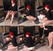Heute erfülle ich mal wider einen Userwunsch . Ich ziehe mir vor dem Ofen sitzend eine Nylonstrumpfhose an, offene Schuhe dazu und trage obenrum ein schwarzes Shirt. Ich knie mich vor den Ofen um ihn zu reinigen und von der alten Asche zu befreien dann nehme ich alte Zeitungen zerknülle sie und lege sie hinein dann ne große Menge Holz obendrauf . Ohne Anzünder nur mit der Hilfe des Papiers entzünde ich das Feuer mit einem Streichholz . Ich warte und kauer vor dem Ofen bis es brennt, Fege noch vorm Ofen und lasse es brennen.