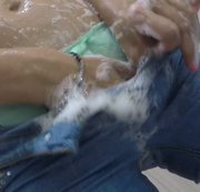 Modeling in my pale cotton panties, showing my cute ass, than putting on jeans, teasing a bit, feeling desperate to pee I strat to feel horny so I pee in my jeans a lot, pulled them down to show my panties and pee again..a lot...a lot indeed! Feeling so horny I get off rubbing my pussy through my wet jeans! After that I went to the bath where I took a shower dressed, pouring shower gel all over me and in my jeans and panties! And getting off again!