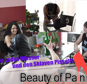 Wir saßen zusammen am Tisch und plauderten etwas. Aber wenn man Gäste empfängt sollte man diese auch gut bewirtschaften also schnippste ich mit den Fingern und mein Sklave eilte herbei! Ich befahl ihm uns etwas Sprudel zu bringen. Doch was wäre ich nur für eine Herrin wenn ich meinen Sklaven vergessen würde. Jedoch bekam er kein Sprudel, sondern wie es sich gehört meine Pisse die ich ihm auch gleich frisch abfüllte!!