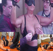 2 Jungs wollten meine Partnerin mal angekettet benutzen, im Zimmer wurde sie zuerst an der Decke angekettet und fingen an sie abzugreifen, nachdem sie ihr die Augen verbunden hatten. Ihre Möse wurde schon ganz feucht vor Aufregung was die beiden alles mit mir machen würden sagte sie mir hinterher. Sie holten ihre Titten aus dem BH und lutschten und bissen ihr in die Nippel, dann wurde sie auf dem Bett dirigiert, und dort wurde sie an den Bett Pfosten, Arme und Beine auseinander gezogen wieder angekettet. Sie Zogen ihr den Slip aus und legten ihre Euter frei und fingen an ihre bereits nasse Fotze an zu fingern, und auch fing einer an sie zu lecken. In Ihrem Kopf spielte sich ab was als nächstes die beiden mit ihr anstellen würden.