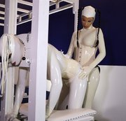 Die weissen Dolls im blauen fetisch Raum, Latex Lara trägt ihren dicken Umschnalldildo und hat den aufblasbaren Plug bereit. Fixiert an einem Pranger Stuhl, hat Latex Lea auch keine Wahl.Lara benutzt den lange nicht trainierten hintern ihrer Doll