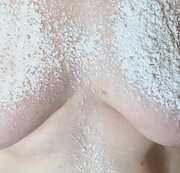 Meine Brüste werden mit Puderzucker verziert, später kommt auch etwas Wasser hinzu. Ein klebriger, glitschiger Belag entsteht dabei auf meinen Titten. Dieser wird schön einmassiert. #titten #nippel #devot