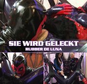 Rubber de Luna hängt in der Liebesschaukel und wird von Carmen Fire und mir mit einem Vibrator für den Latexsklaven vorbereitet, der sie lecken wird. Wir machen ihre Latexmuschi schön feucht wie eine richtige Muschi. Dann holen wir den Latexsklaven dazu. Er muss zeigen was er kann. Er lutscht und fingert ihre feuchte Möse abwechselnd und wir Ladies schauen dabei zu wie er Rubberdoll zum Orgasmus bringt.
