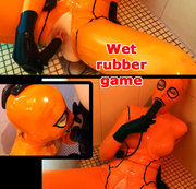 Rubberbitch is taking a shower. Her covered in an orange latex catsuit body is luxuriating under water streams. She's touching her body, fondling it. Master notices her mood and decides to join the game. He claps Rubberbitch's bottom, unzips her catsuit and pushes his fingers inside Rubberbitch's pussy. He makes her to stand on her knees for a blowjob work. She does it with a great pleasure, masturbating while working with her mouth. But that's not all. Shower is too good place to use it only once. Rubberbitch sequesters herself in a shower to continue the game by herself.