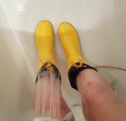 Schaut wie lange ich meine blauen Gummistiefel in der Wanne angepisst habe