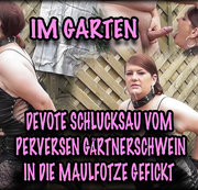 Heute war das Wetter mal wieder etwas besser und mein Gärtner war da. Ich zog mir also ein geiles Outfit an um ihn ein wenig heiß zu machen, doch was dann passierte, damit hat keiner gerechnet.... Er legte mir ein Halsband an, fesselte meine Hände auf dem Rücken und befahl mir, ihm einen zu blasen, was ich dann auch tat. Er hat mir seinen harten Schwanz immer wieder in die Maulfotze gerammt, sodass ich würgen musste. Er kannte kein erbarmen und spritzte mich mit seinem Saft von oben bis unten voll. #bondage #blasen #outdoor #devot #gesichtsbesamung #deepthroat