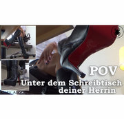 Du kleiner #Sklave darfst brav vor mir auf dem Boden rumkriechen. Während ich mit Bluse, Rock und #Glanzstrumpfhose arbeite, darfst du unter dem Schreibtisch meine geilen #Lederstiefel sauber lecken und dich um meinen Abfall kümmern. Aber du hast Glück: Du hast dabei einen geilen Blick auf meine Sohlen und Nylons. Also los! Fang an zu lecken!