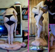 Firstly mistress Ignis and her friend Hella weigh on electronic scales one by one, and then together. After that, Mrs. Ignis jumps on Hella and they stand on the belly of a slave who is given the order to masturbate. Then they take another position, putting their feet on his belly, and he cums to their feet, almost crushed under their weight. #trample #crush #belly