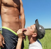 Sasha sucked Zhenya's cock on the road in the middle of the field and ate his sperm