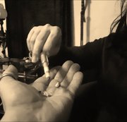 Zur Nacht Nacht noch eine Zigarette...genussvoll mit der Zigarettenspitze...die Asche in die Hand